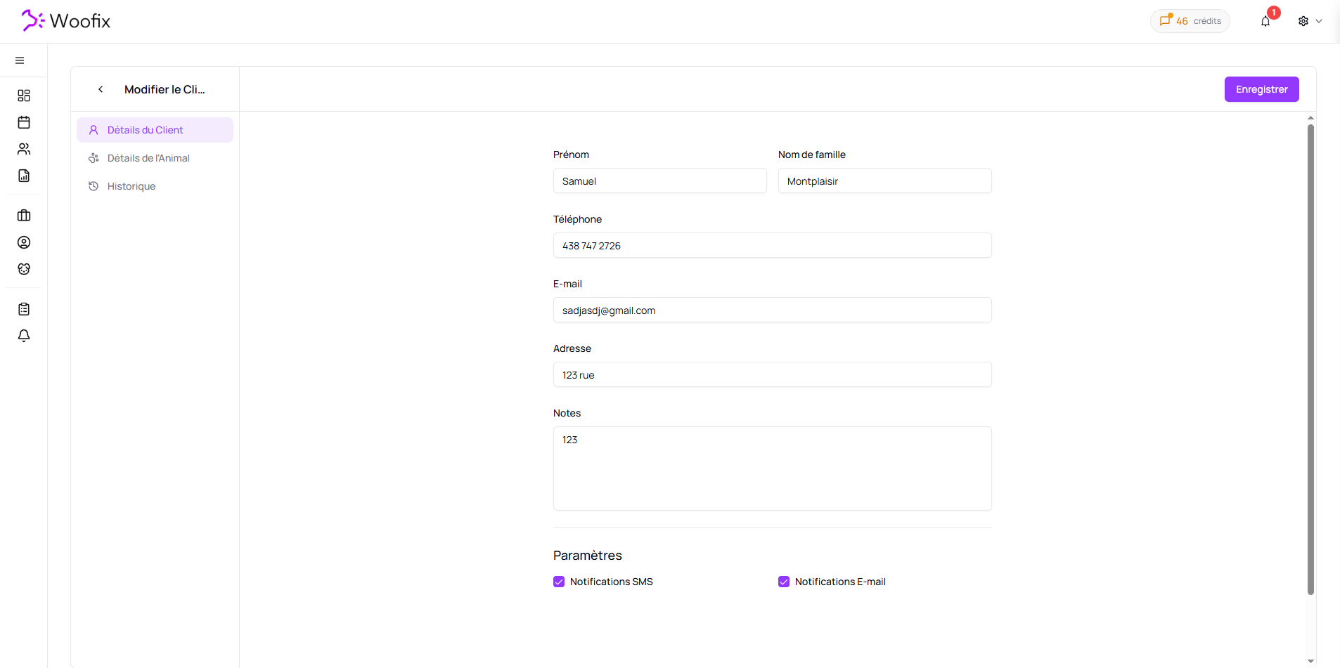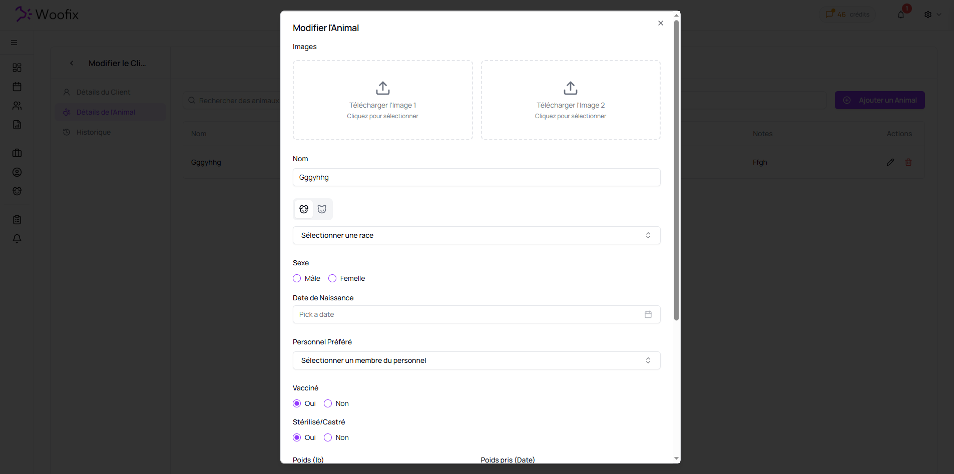 Une fois dans la fiche d'un client, l'onglet Détails de l'animal vous permet de gérer les animaux qui lui sont rattachés. Vous pouvez en ajouter plusieurs, les modifier ou les supprimer.