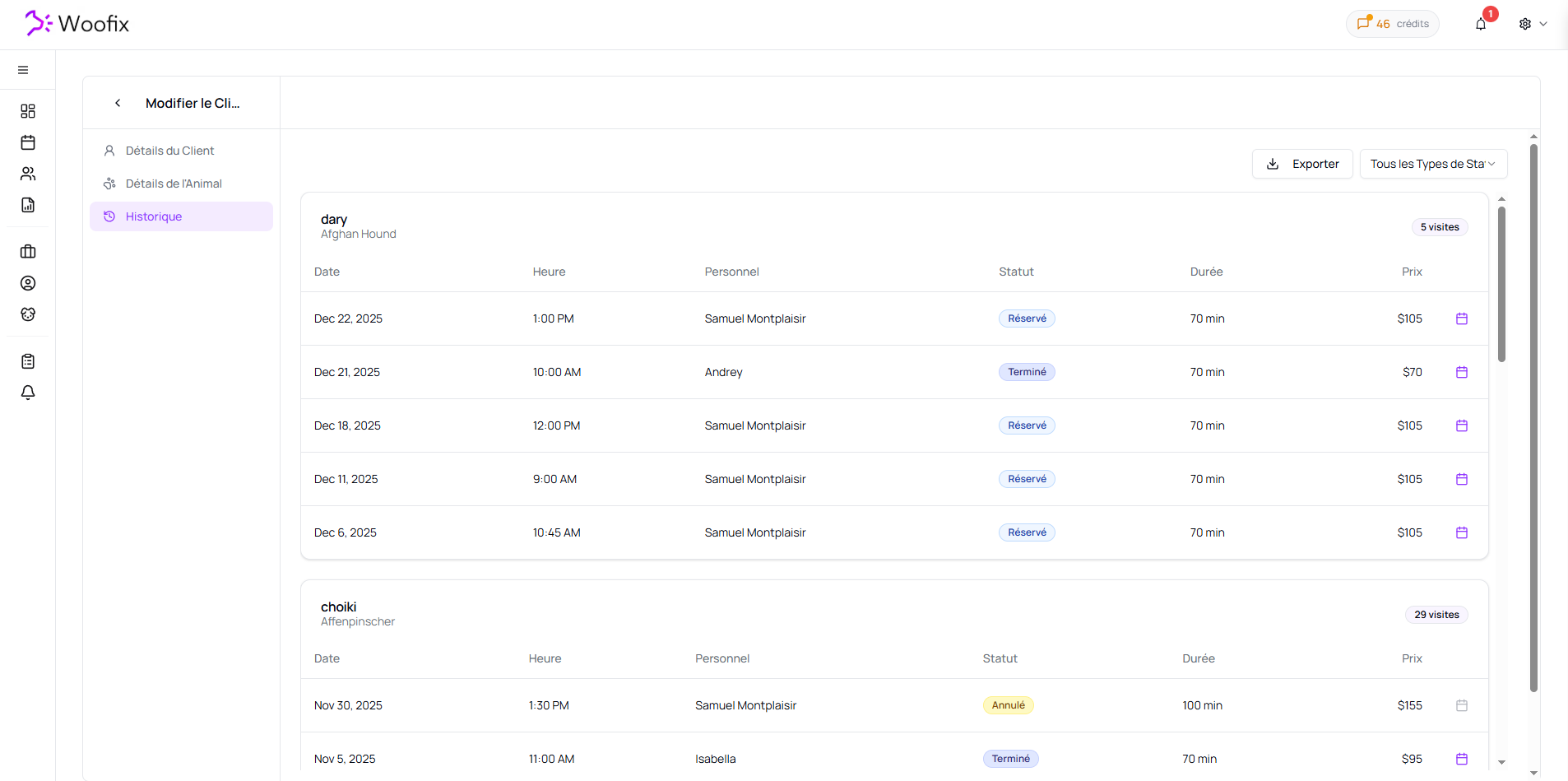 Once inside a client’s profile, the Pet Details tab allows you to manage the animals linked to them. You can add multiple pets, edit them, or delete them.