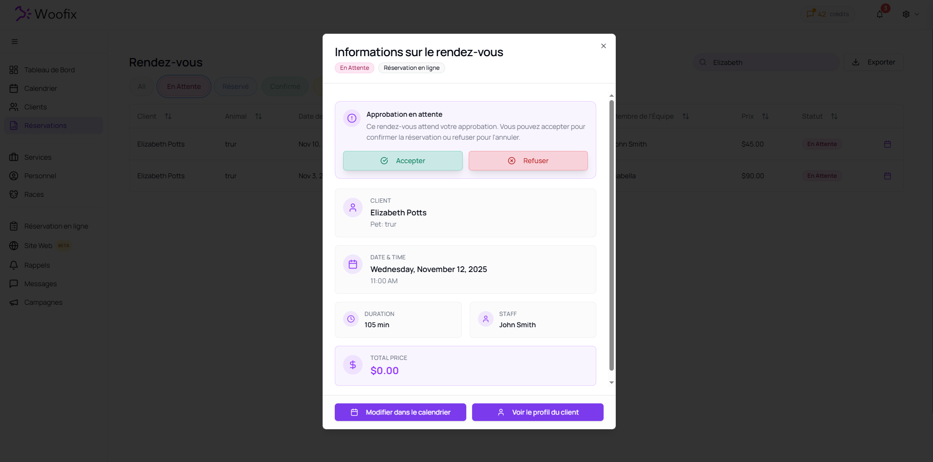 - Passez par la fenêtre pour naviguer rapidement vers le profil du client ou la modification du rendez-vous dans le calendrier.