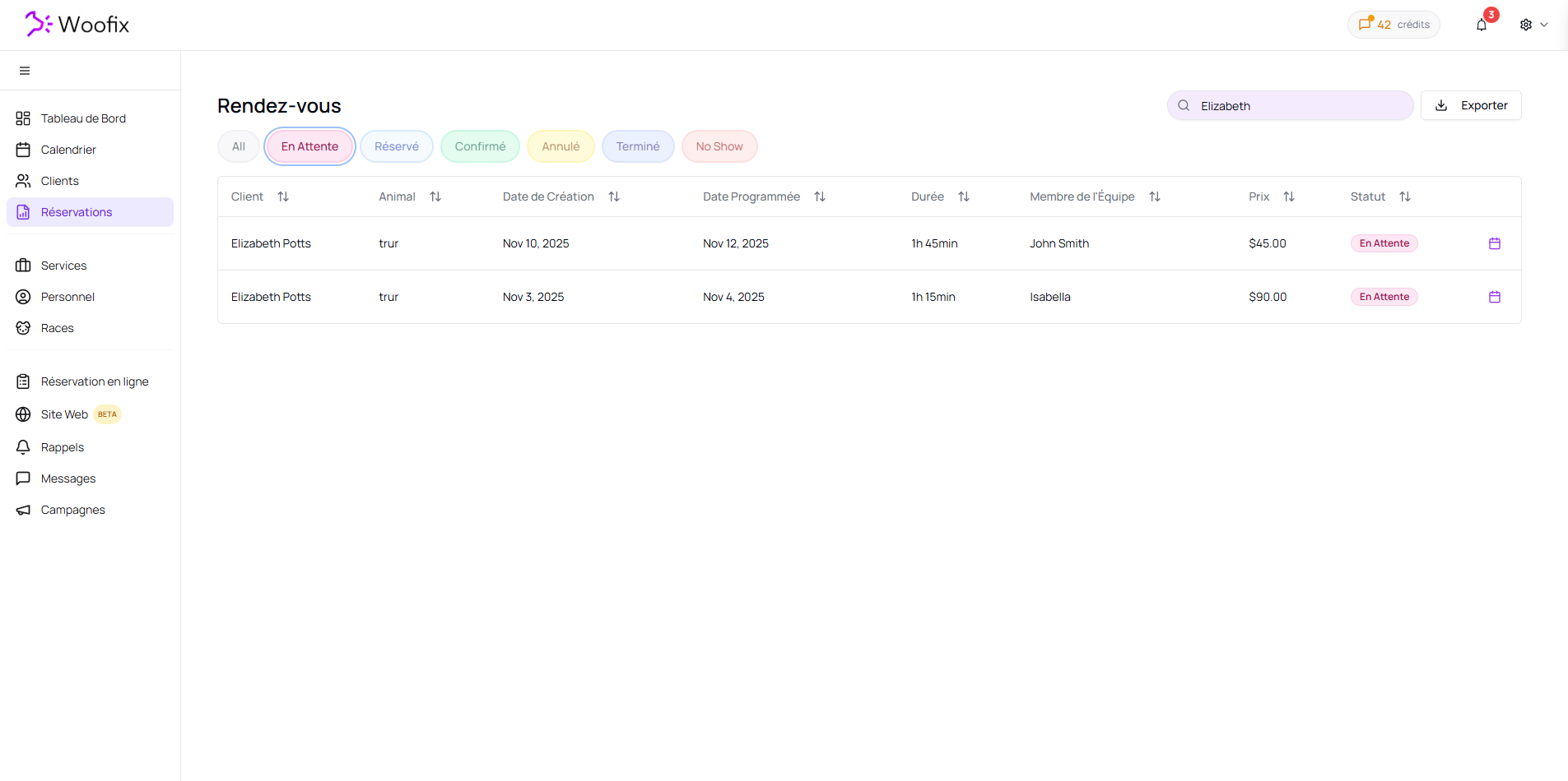 - Barre de recherche : Tapez simplement le nom du client ou le nom de l'animal pour isoler ses rendez-vous.
