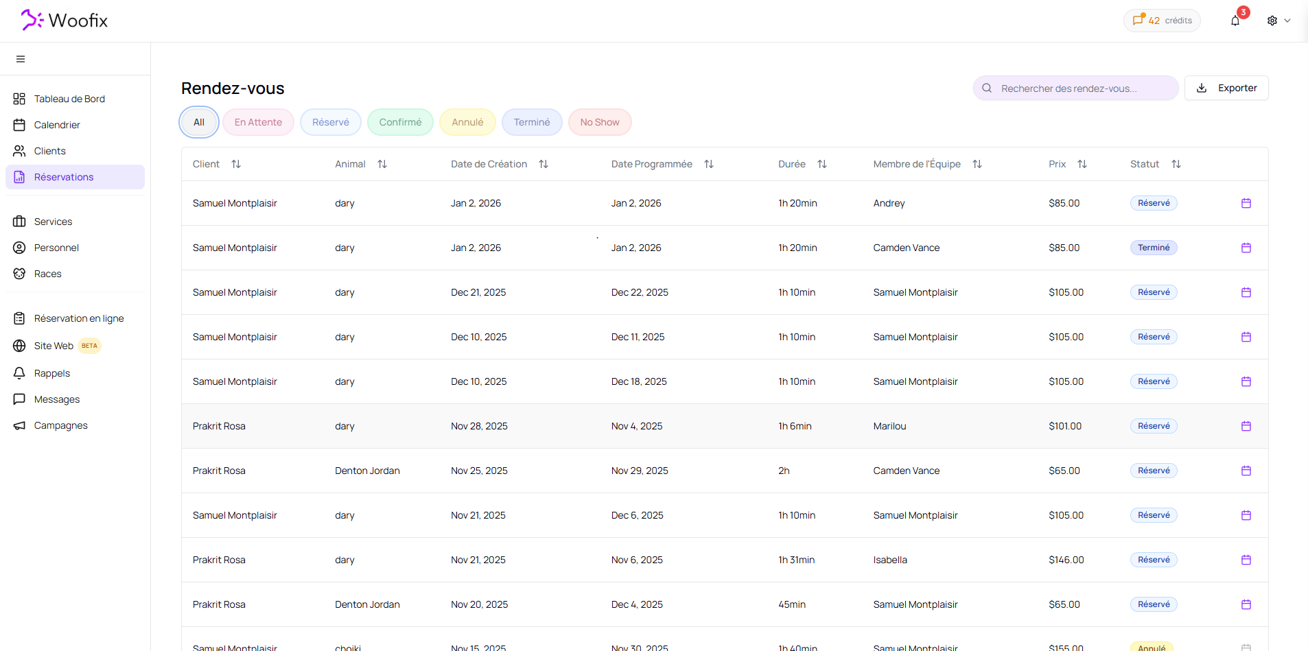 Cette page affiche la liste complète de tous les rendez-vous enregistrés dans Woofix.