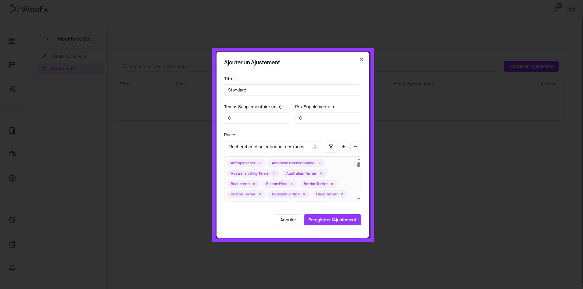Les ajustements permettent de modifier le prix et la durée selon la race, mais ils servent aussi à valider quelles races ont le droit d'accéder au service.