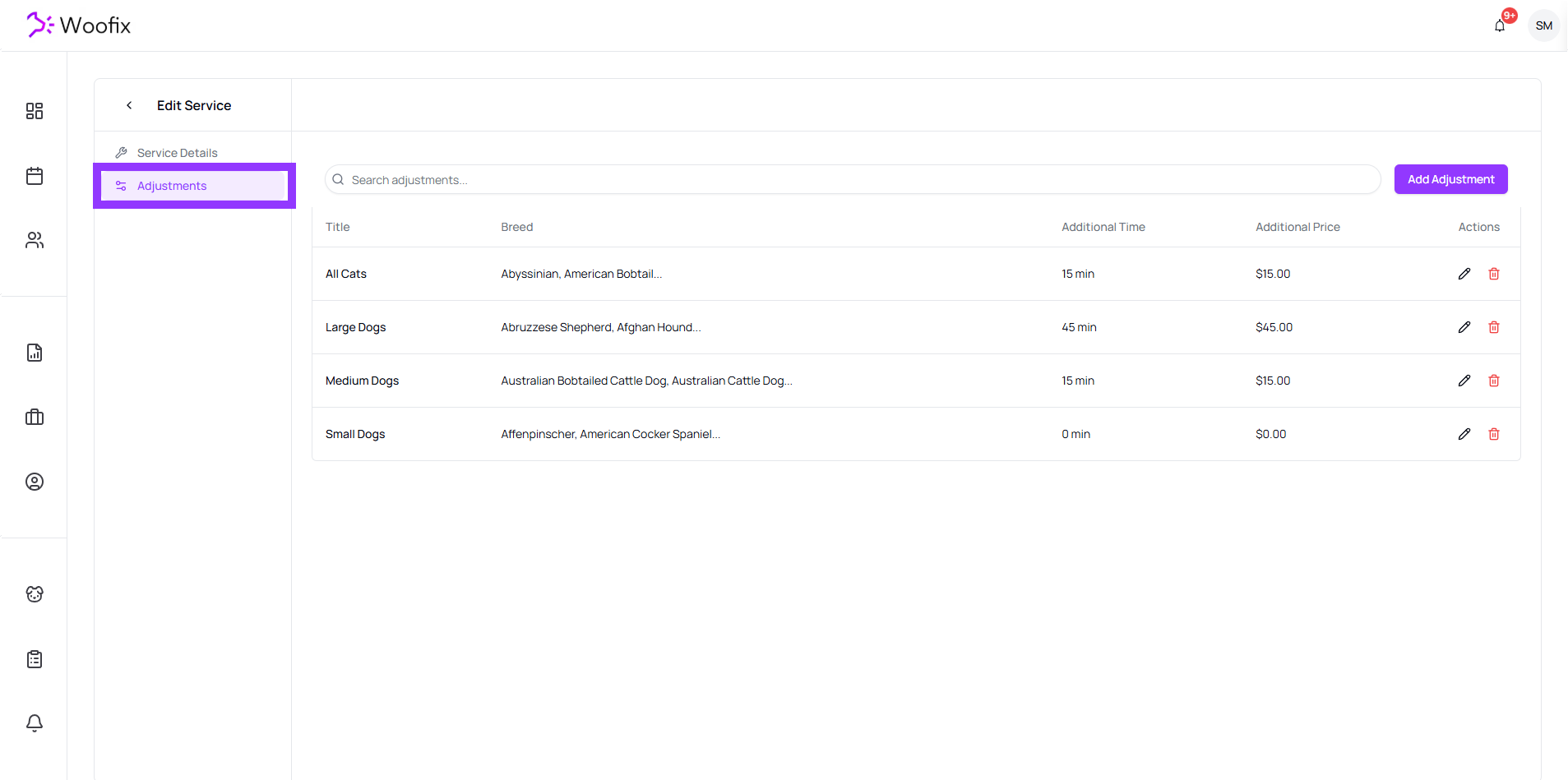 Dans la section Ajustements du service, cliquez pour en ajouter un nouveau.